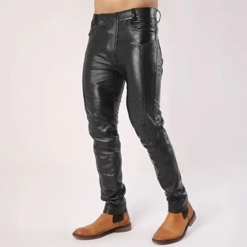 Men's Black Motorcycle Leather Pants With Pocket Male Low Waist Bodycon PU Trousers Stretch Slim Pants