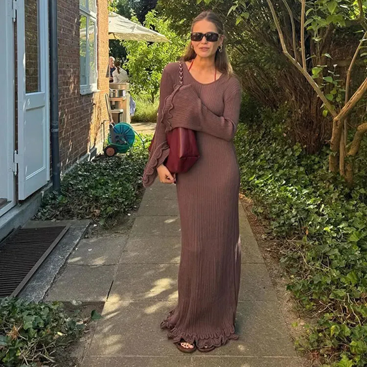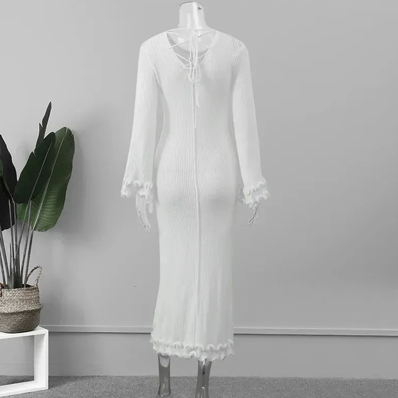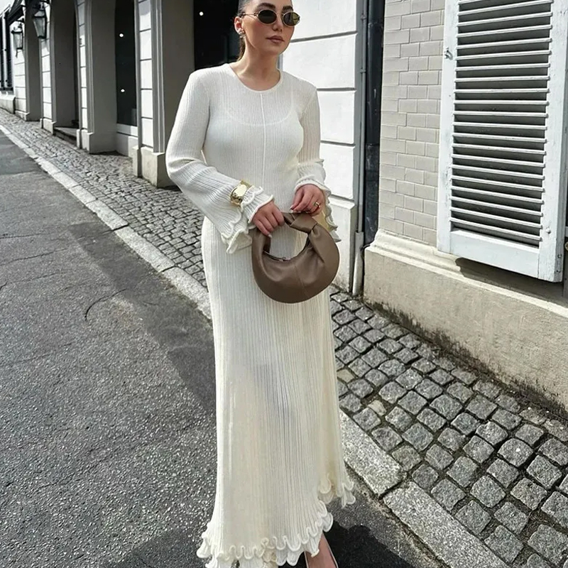 Women's White Pleated Hem Knitted Long Skirt Elegant O-Neck Dress