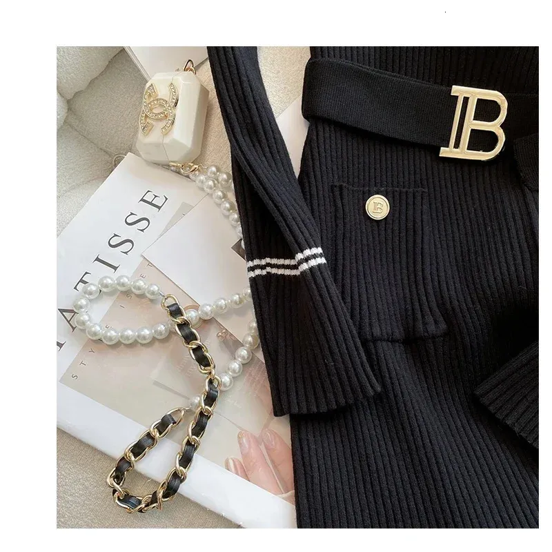 Autumn Winter Women Knitted Dress Fashion O-neck Buttons Bodycon Sweater Dress with Belt Lady Office Dress