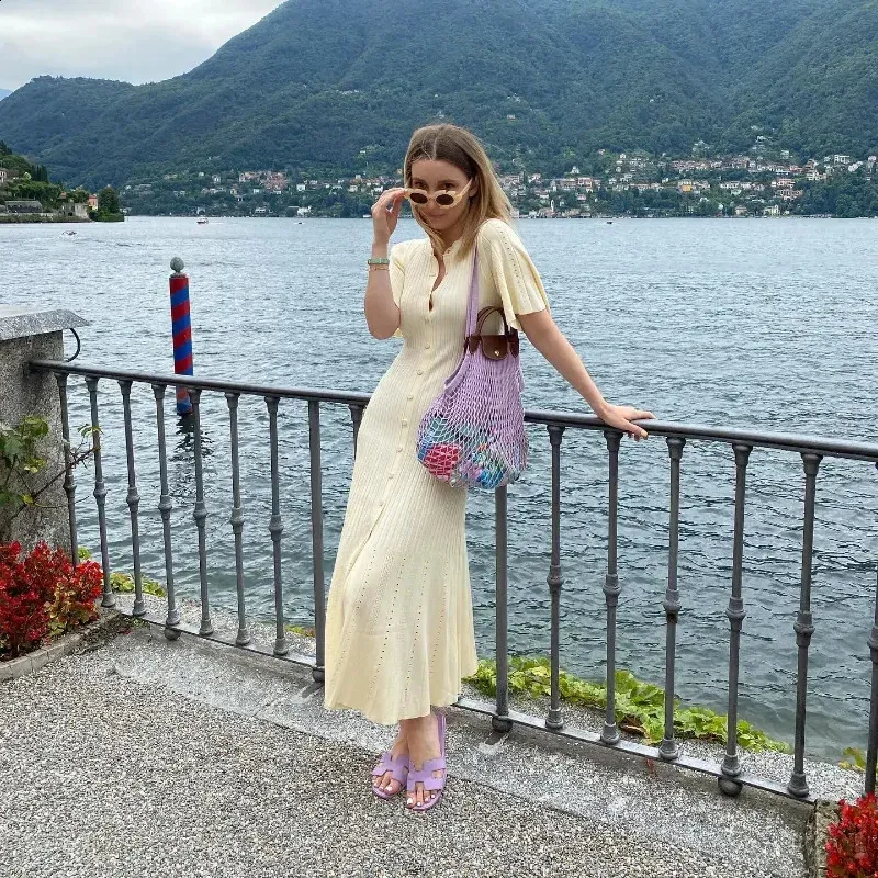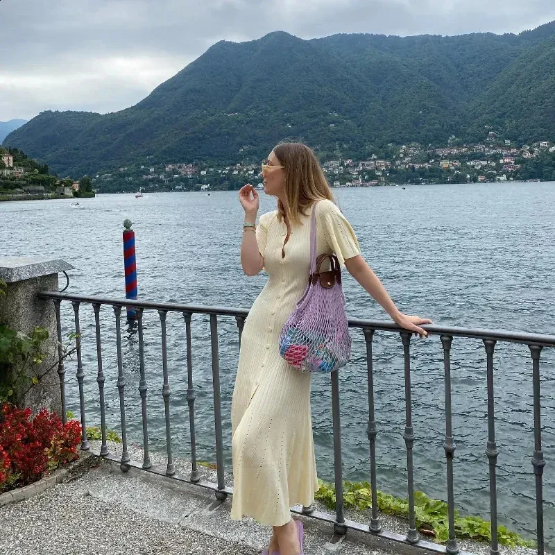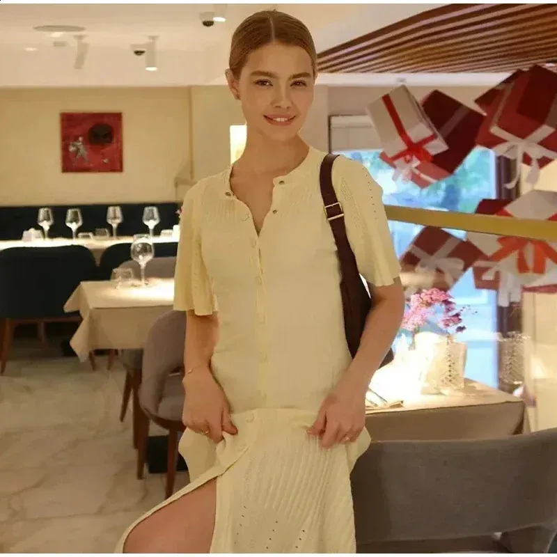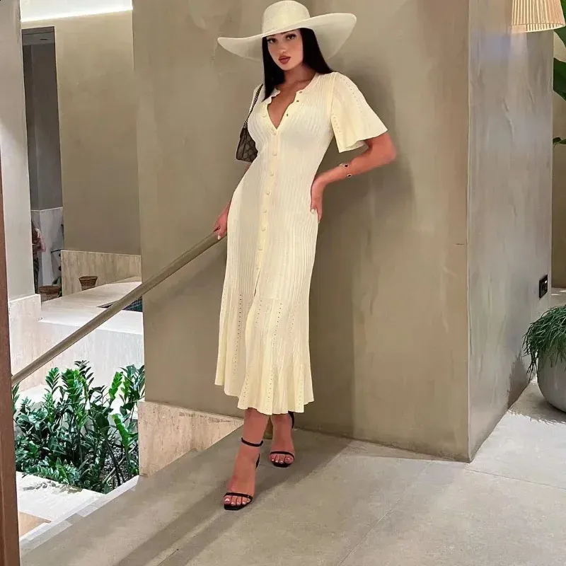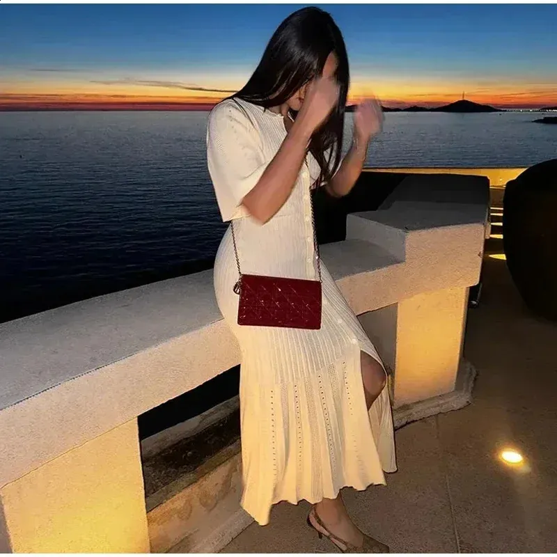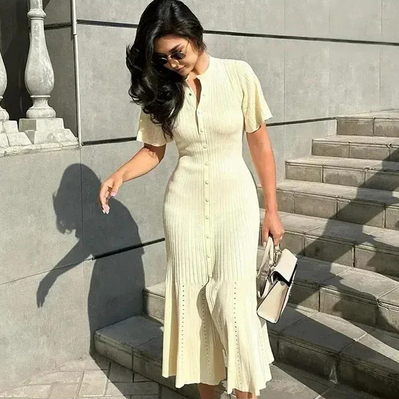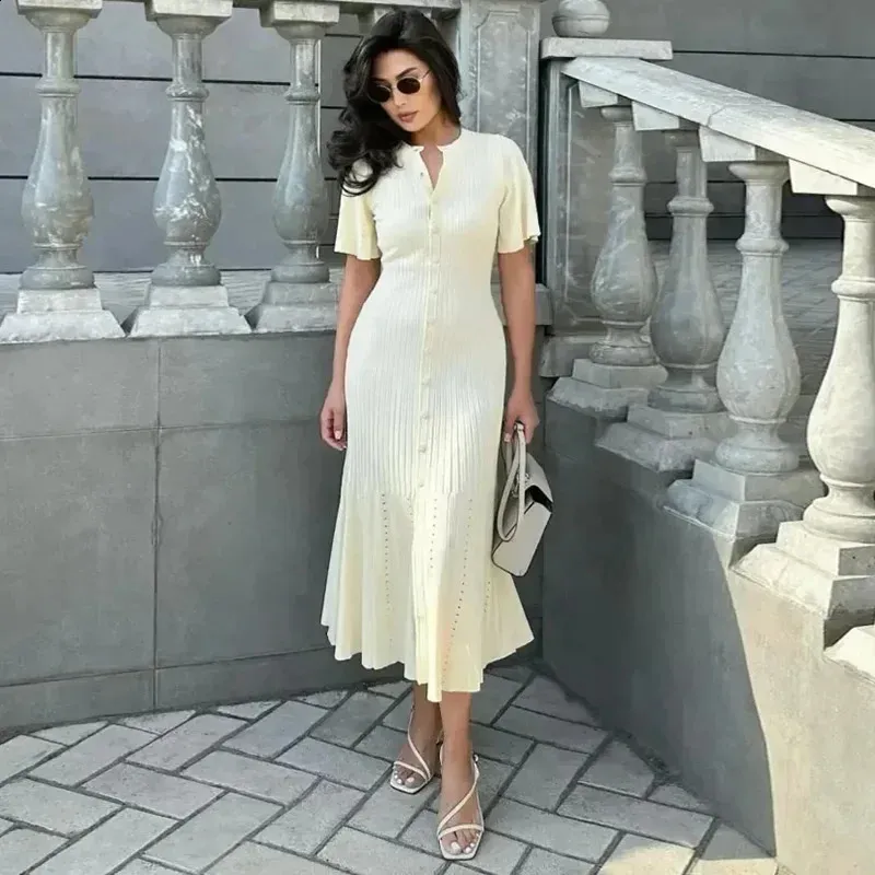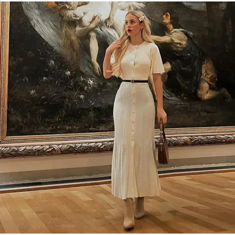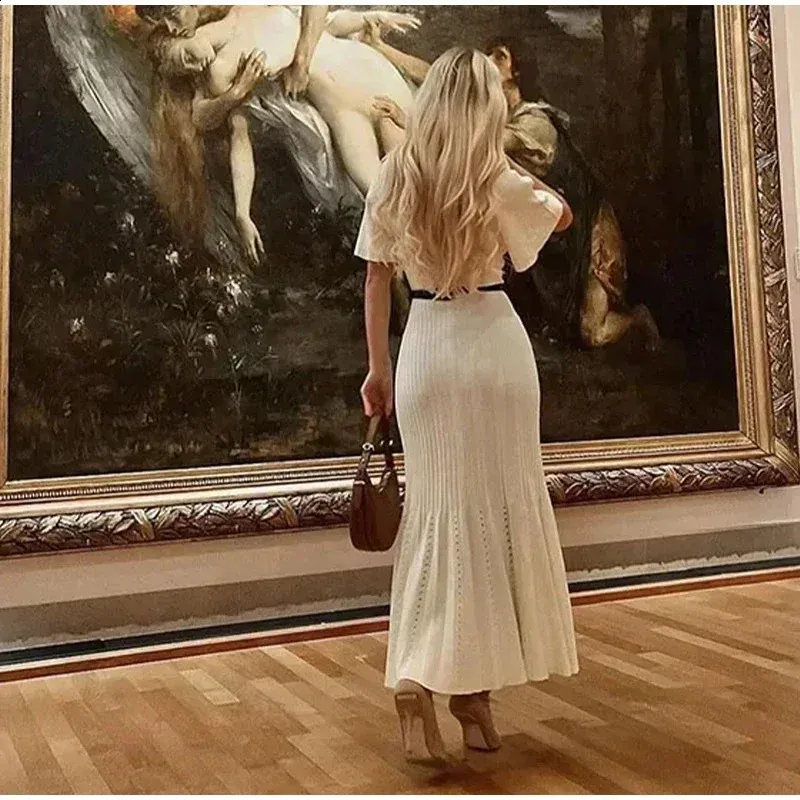 Elegant Knitted Ribbon Long Skirt Women's Slim Fit O-neck Short Sleeve