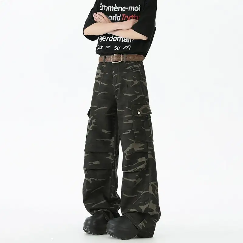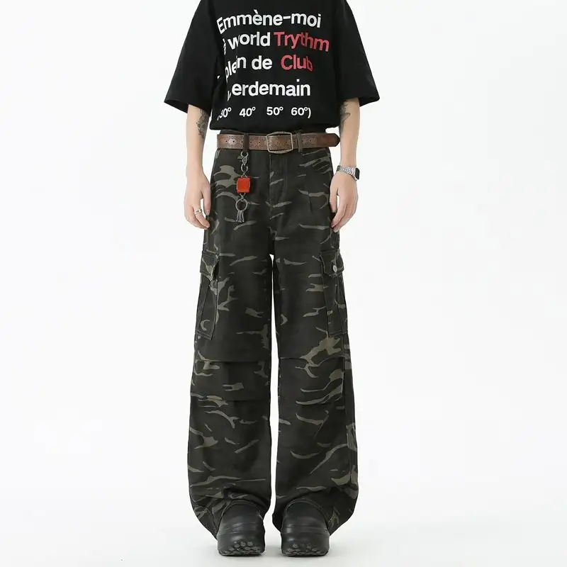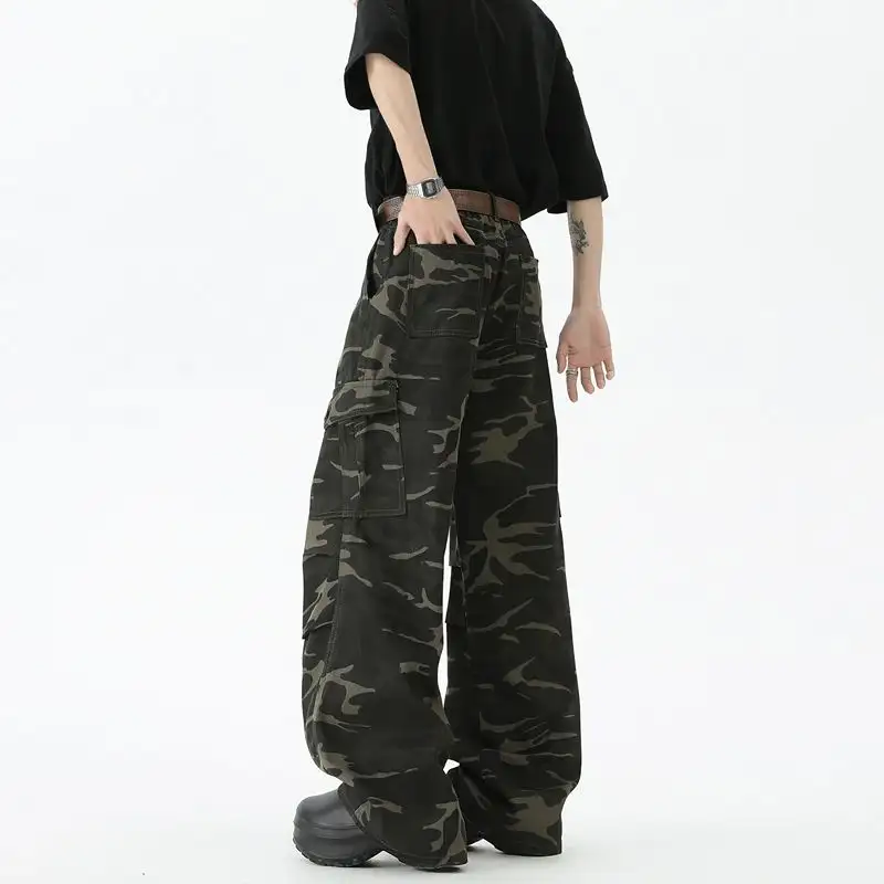 Men Retro Camouflage Sports Work Pants Loose Wide Leg Casual Trousers For Men With Straight Cargo Denim Pants