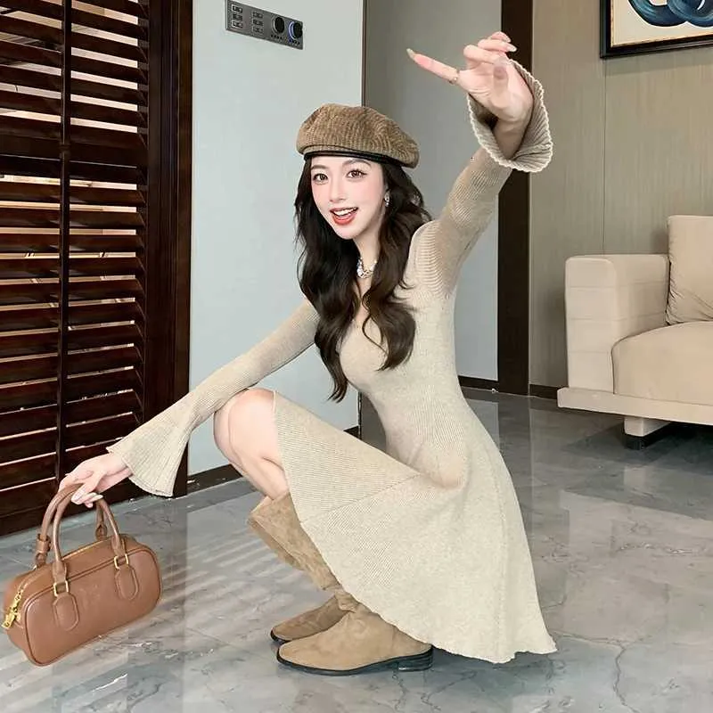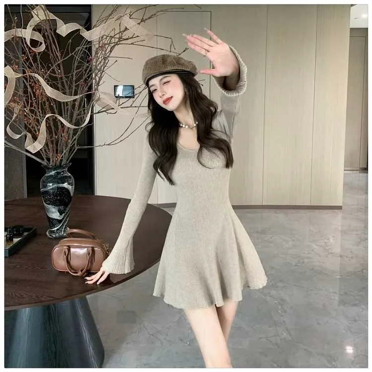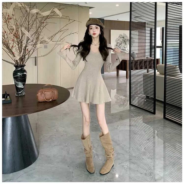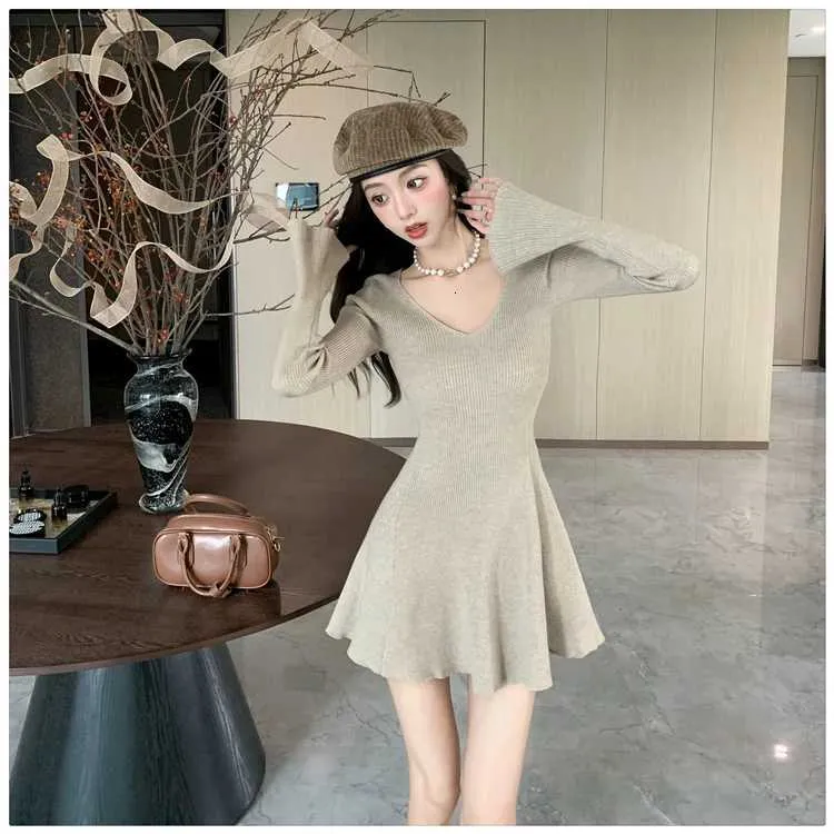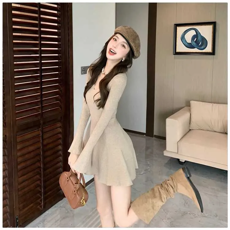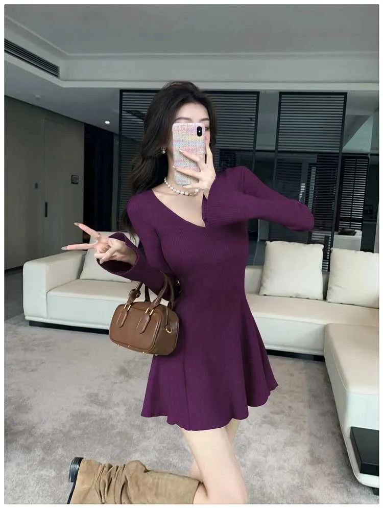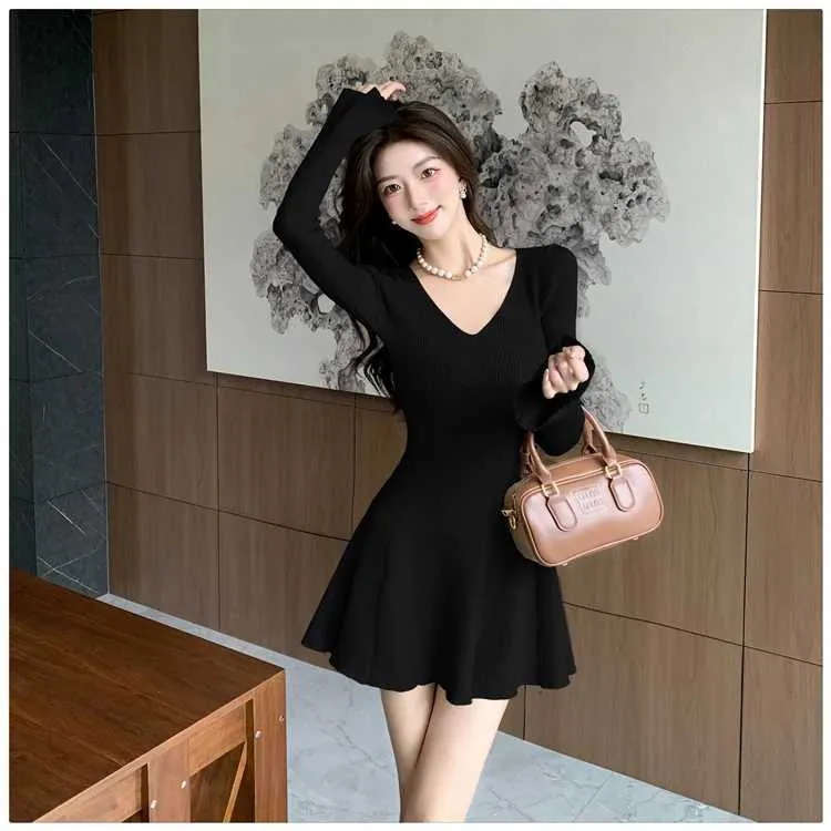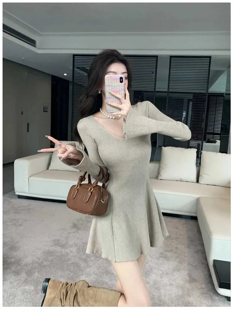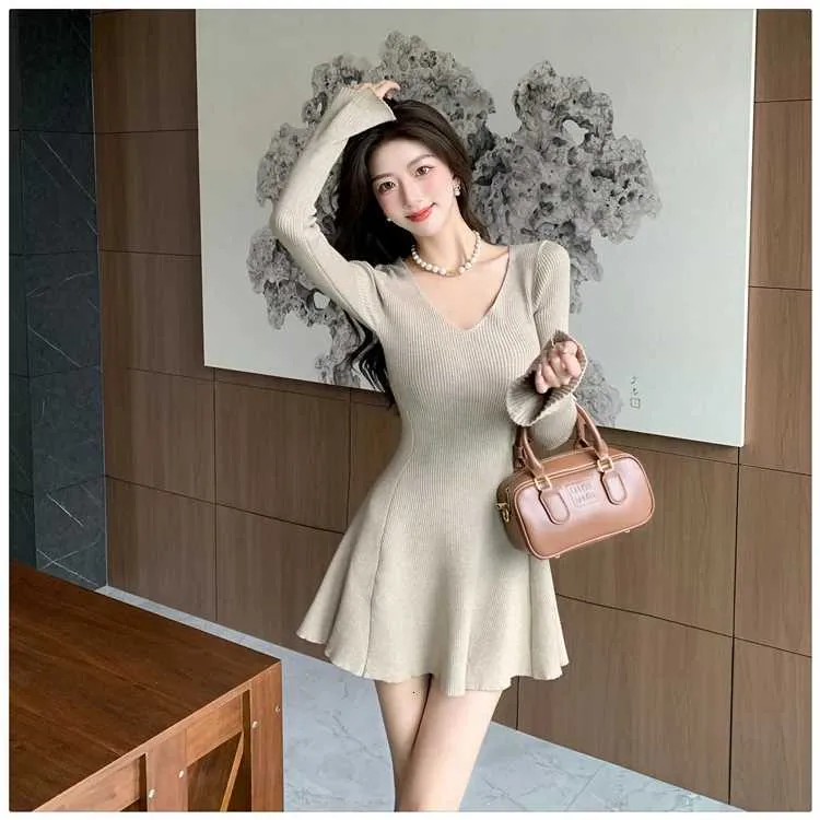 Autumn Vintage Minimalist Knitted Dress Women's V-Neck Flared Sleeve Slim Sweater Mini Dress Casual Office Lady