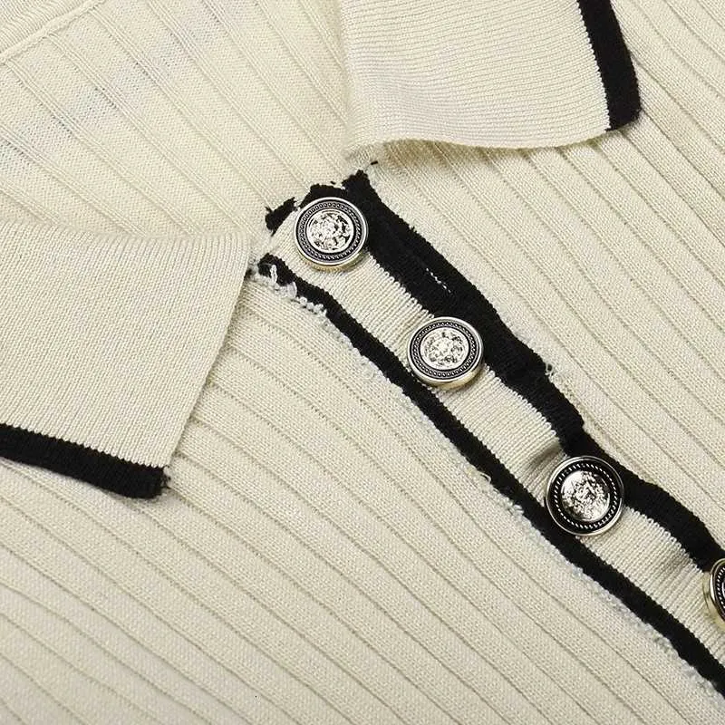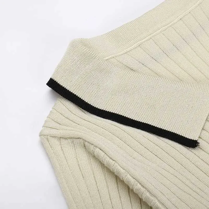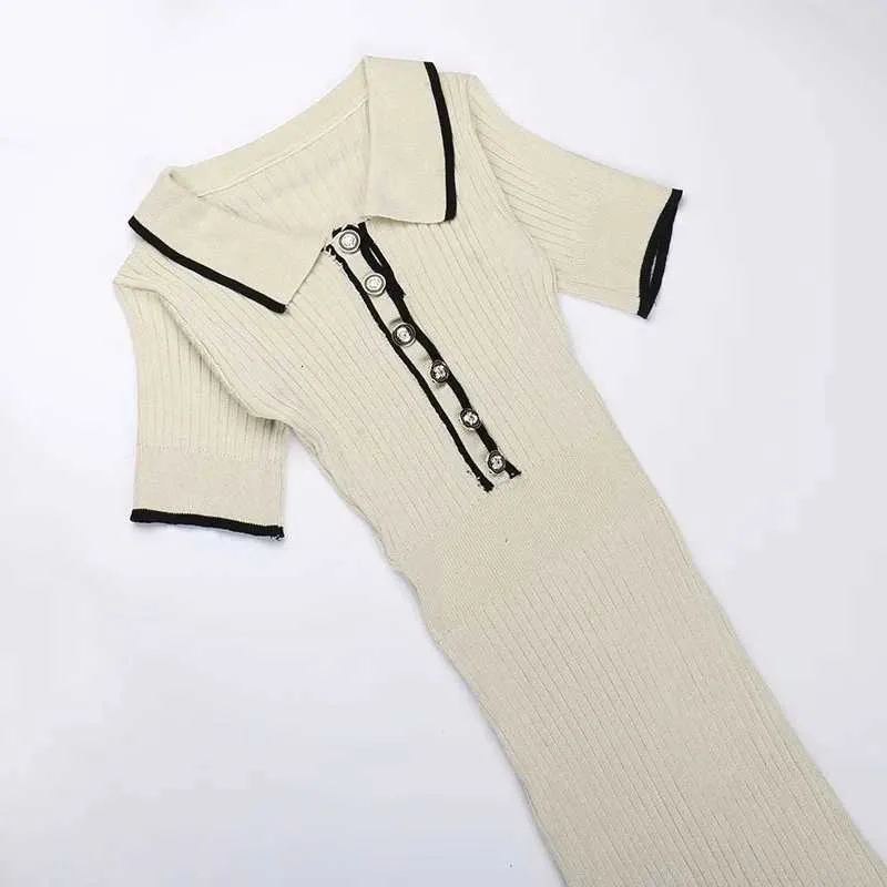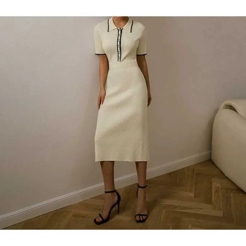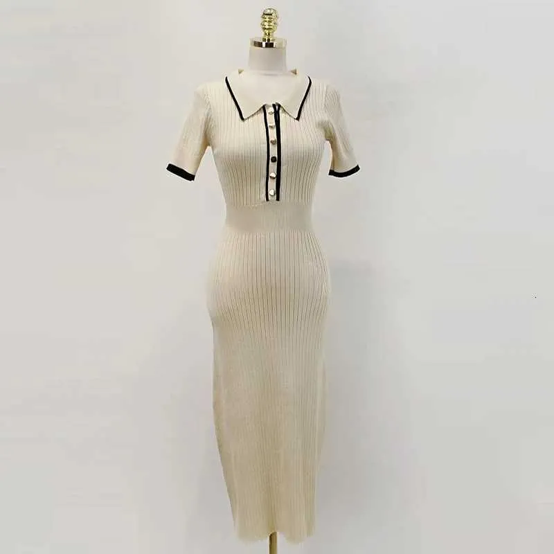 Fashion Knit Sweater Dress Women Ribbed Contrast Short Sleeve Lapel Gown Dress Ladies Long Dresses