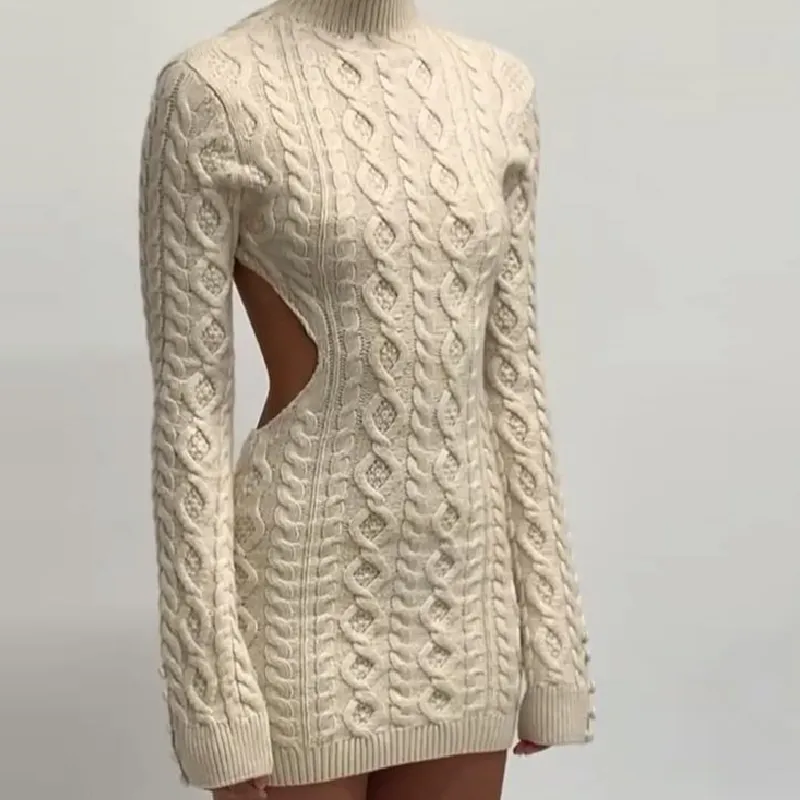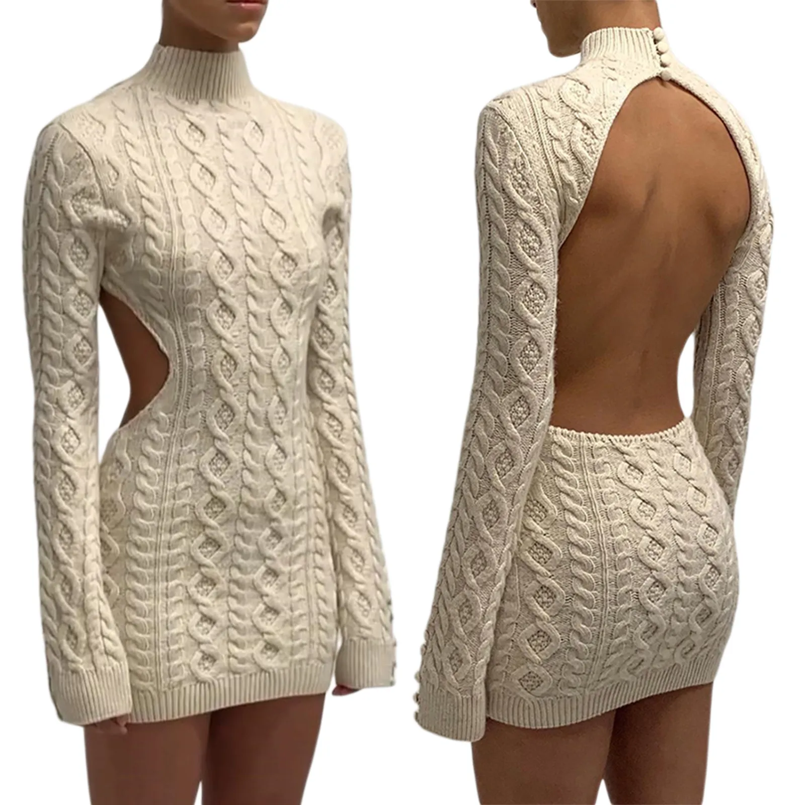 Casual Dresses Women Autumn Winter Knit Sweater Dress Turtleneck Cable Long Sleeve Backless Wool Mini Slim Fit Dress