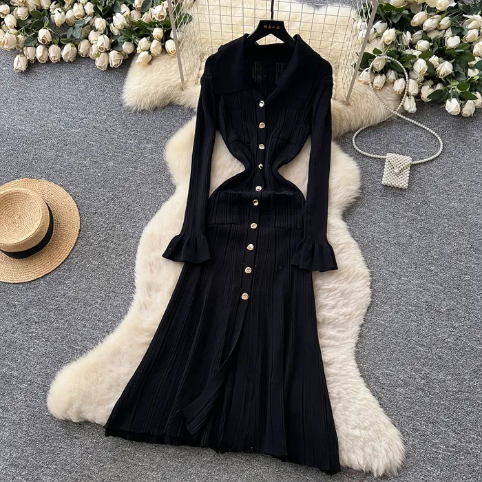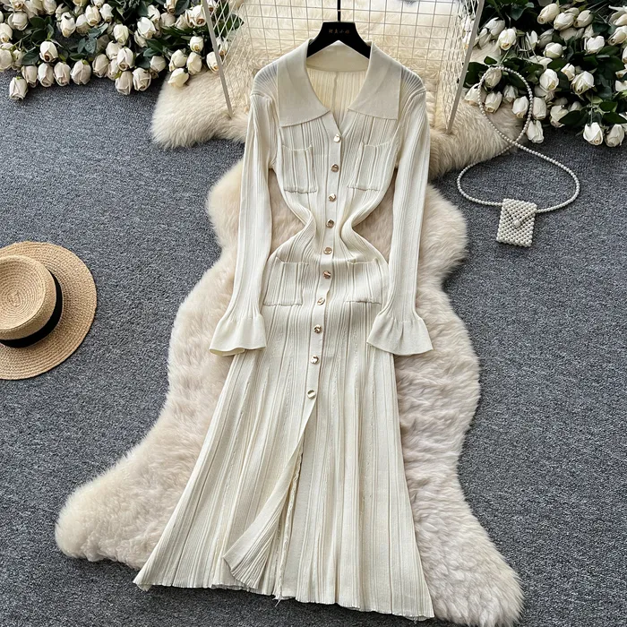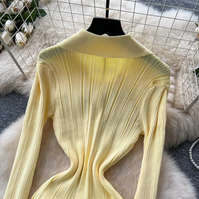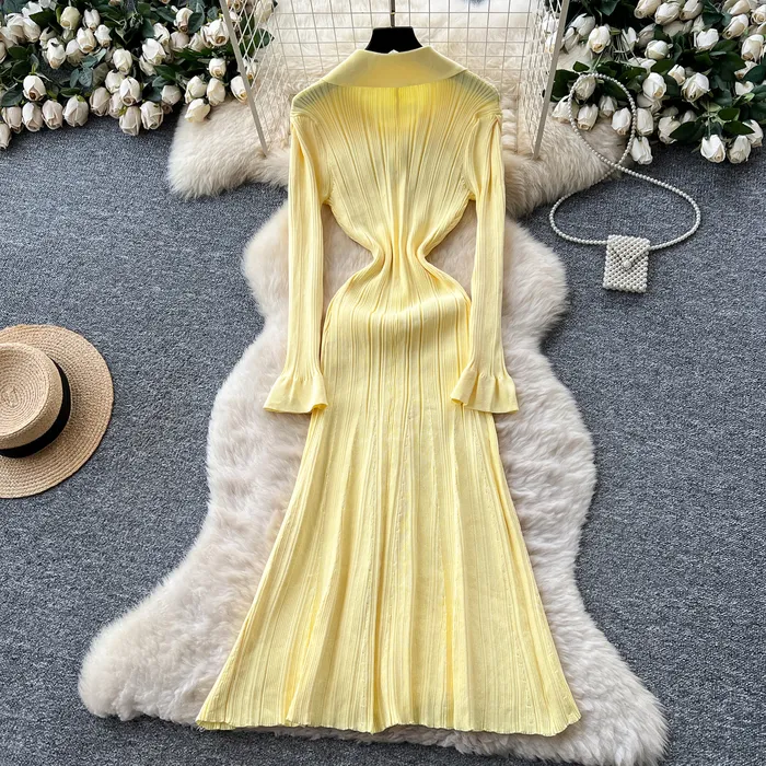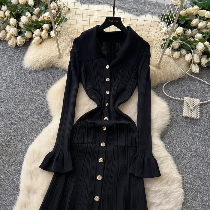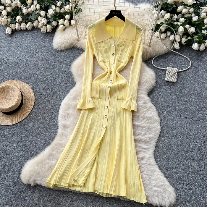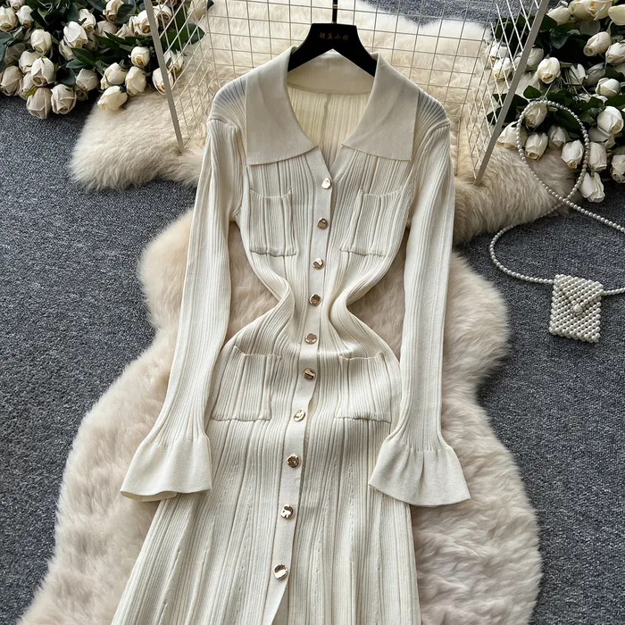Style Simple Knitted Long Sleeve Dress For Women Autumn TurnDown Collar Slim Fit Elegant Mature