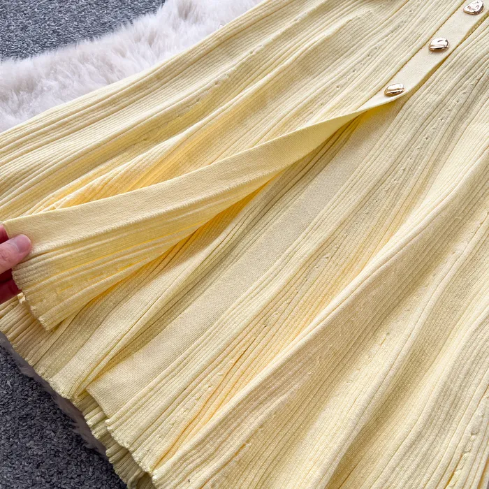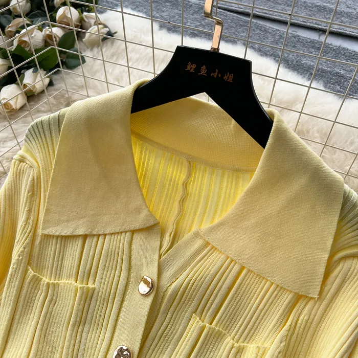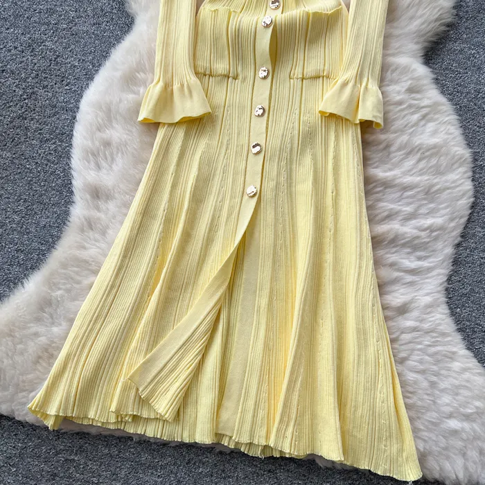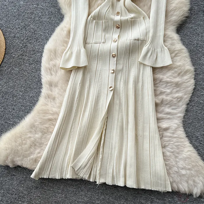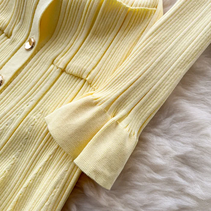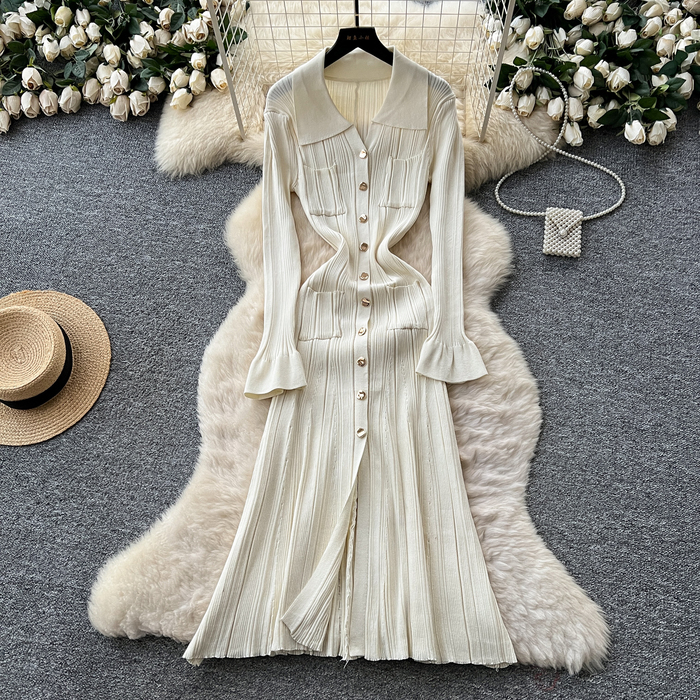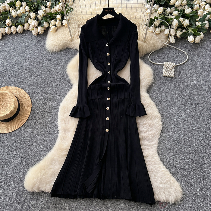 Style Simple Knitted Long Sleeve Dress For Women Autumn TurnDown Collar Slim Fit Elegant Mature